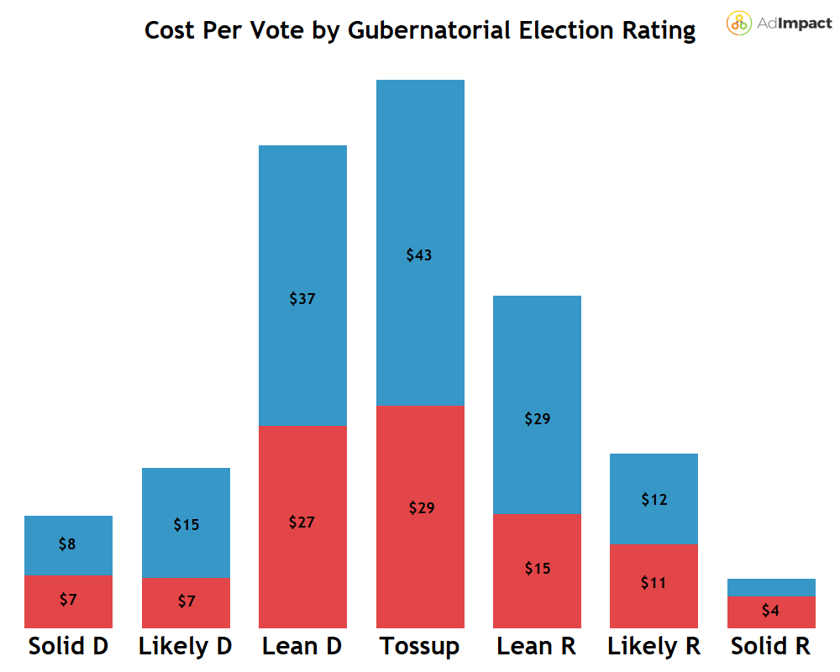 In the world of political advertising, the total amount of money an advertiser spends will not always fetch the same ad rates across the country. For instance, the New York City media market is more expensive than the Juneau market, and candidates have cheaper ad buying rates than issue groups. Because of this, the cost per vote (CPV) can differ wildly based on a variety of factors. CPV is comparing the amount of ad money spent to the number of votes received in respective elections.