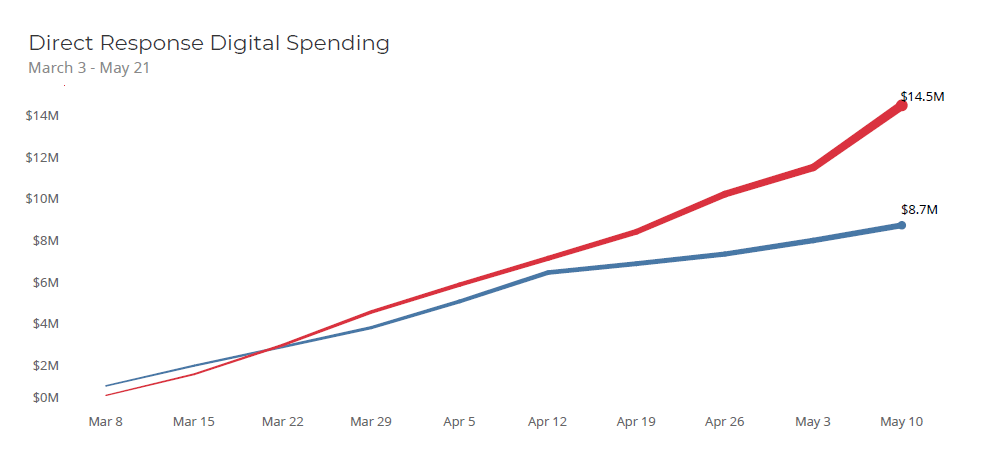 As in 2016, Trump has leveraged a robust digital strategy that uses a variety of creatives and microtargeting to drive different aspects of his base into donating to his reelection campaign. His strong fundraising allows him to regularly outspend his opponents on digital and continue pulling in donations. Biden capitalized on his Super Tuesday success to reach out to potential donors through digital ads. His fundraising-focused digital spending increased steadily through mid-April. But since then, Trump has steadily expanded his lead. The below graph shows the direct response digital spending from each candidate since Super Tuesday.