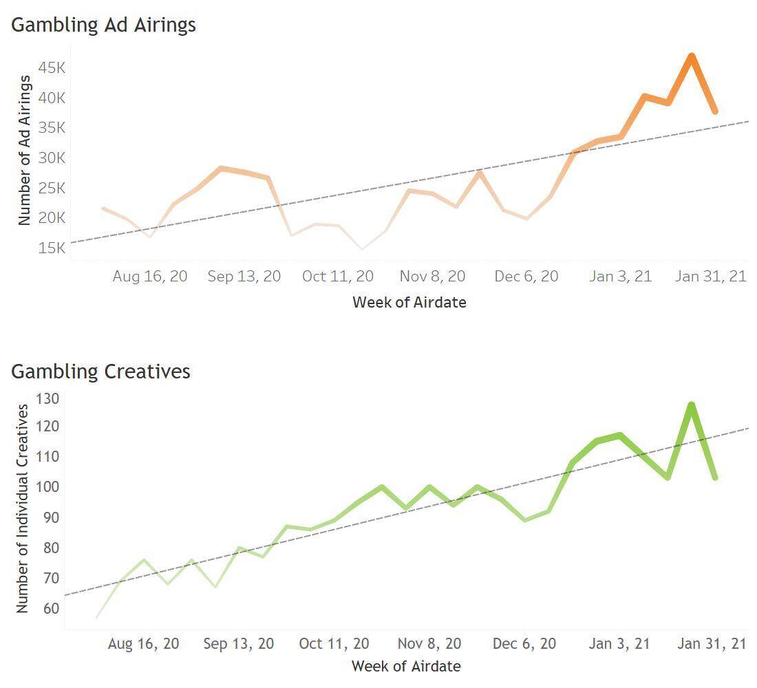 Who’s driving this? It’s mostly the names you know and are familiar with (maybe because you’ve seen an ad of theirs recently). FanDuel, Draft Kings, and BetMGM, among others, have all almost doubled their total number of airings since November 1. They have also increased their share of ads as compared to other gambling companies. FanDuel, for example, has increased their ad airings from 11K the first week of November to 22K last week. Their share of total gambling ads on air went from 4.7% to 9.4% in that same period. Companies that are focused on online poker or other types of non-sports betting have remained relatively constant, allowing those trying to profit off the coming sports betting bubble to make such large gains in the gambling space.