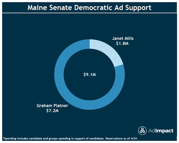 This morning Janet Mills announced she was suspending her campaign, seemingly setting the stage for what could end up as one of the most competitive Senate elections this cycle. Graham Platner will likely be the Democratic nominee to take on incumbent Senator Susan Collins (R). The primary has seen $53M in total ad spending, making it the most expensive Senate primary on record in Maine. With two months left to go, the contest has already surpassed the 2020 Senate primary total of $36M. Nationally, Maine currently ranks as the fourth most expensive Senate primary of the 2026 cycle, trailing Texas, Illinois, and Kentucky.