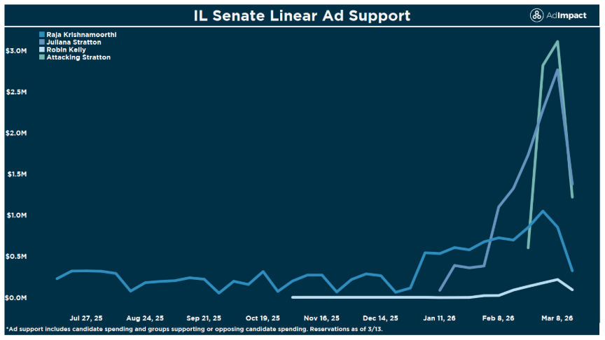 Illinois Senate advertising had been largely positive for much of the contest but has taken on a sharper negative tone in recent weeks. Fairshake launched ads attacking Stratton over alleged donors with “ties to MAGA”, while the Stratton campaign aired attacks attacking Krishnamoorthi over the same thing. Robin Kelly, who has so far avoided any attack ads from the other campaigns and groups, launched an ad yesterday accusing the two other candidates of being more focused on attacking one another than governing.