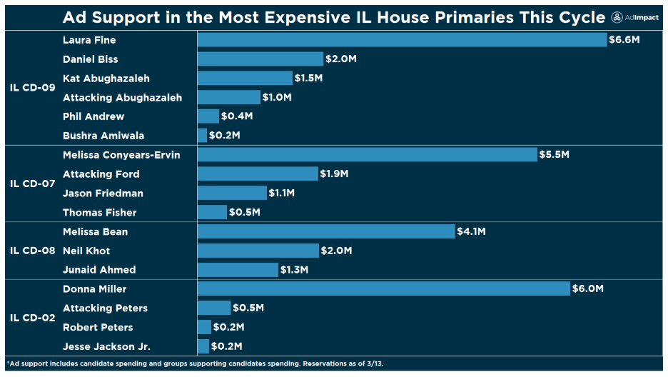 Chicago City Treasurer Melissa Conyears-Ervin currently leads the advertising race with $5.5M in ad support, including $4.7M from AIPAC-aligned PAC United Democracy Project.