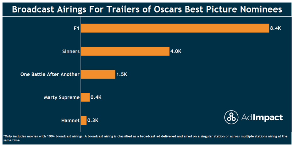 F1 dominated the airwaves, accounting for more broadcast airings than all other nominees combined. Despite that overwhelming presence, the film ultimately took home just one award, Best Sound. One Battle After Another, the winner of Best Picture this year, had 1.5K broadcast airings for its trailers.